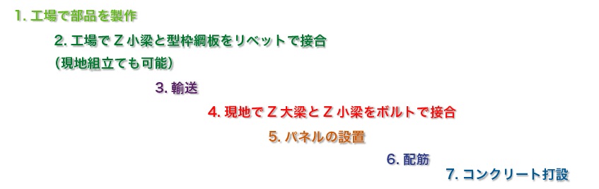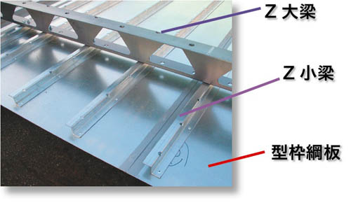 Z大梁、Z小梁と型枠鋼板から成り立っています。 製作もほとんど機械化されています。 |