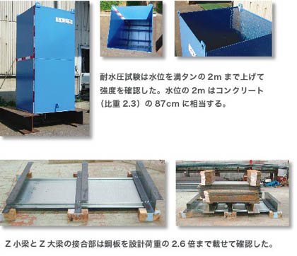 | 以下の試験を行って、安全率2.5を確認しています。 ・型枠綱板とZ小梁の耐水圧試験 ・パネル接合部の耐水圧試験 ・Z小梁とZ大梁の接合部の耐荷力試験 |